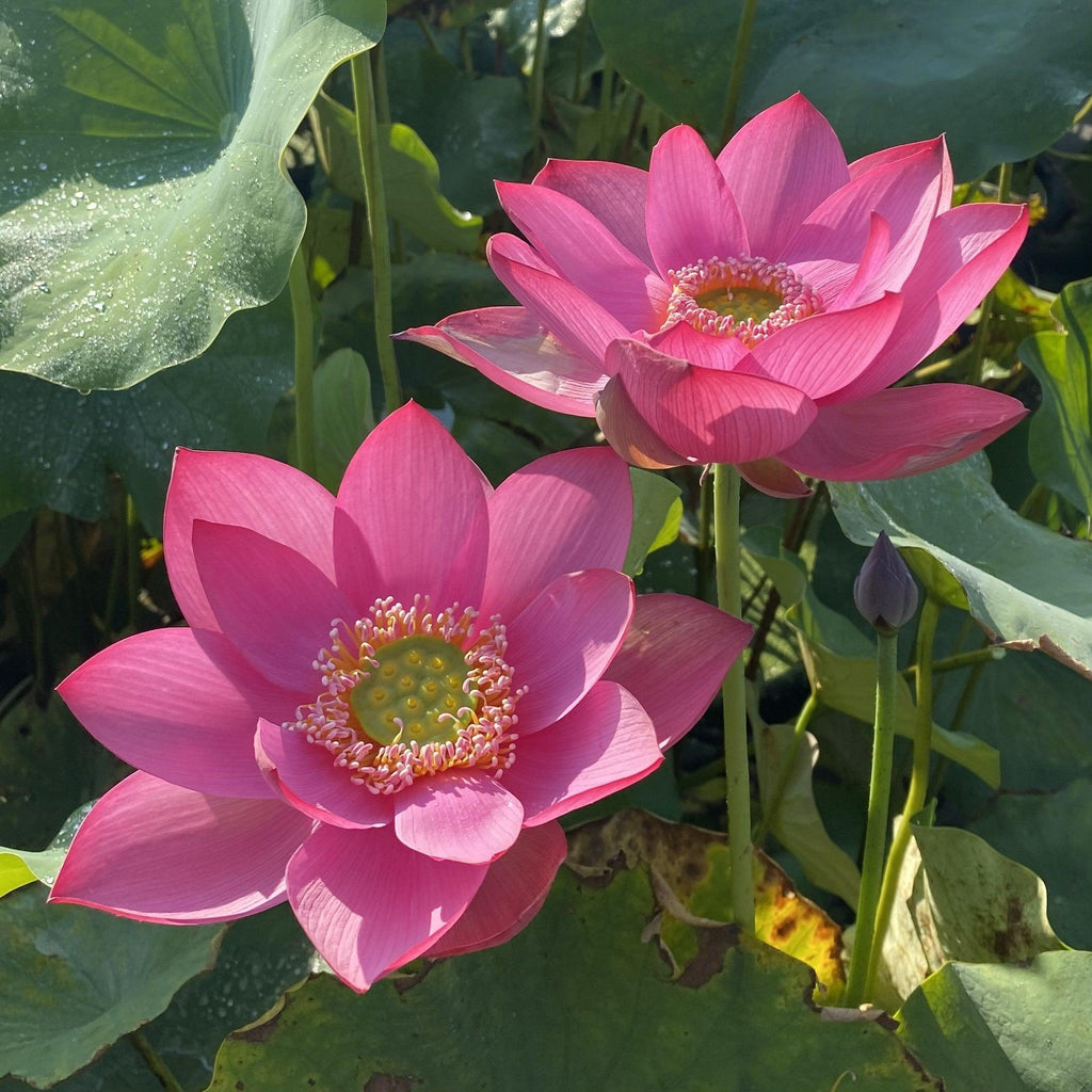 We LOVE this lotus with its supersaturated pink color! 'Beijing Temple of Heaven' was hybridized by Yileen Gardens in Nanjing. We are excited to be able to bring this lovely new hybrid to the United States. It is a tall cultivar with large single petal pink/red flowers featuring an emerald green receptacle with a fancy collar of heavy white anthers on the first day. As the flower ages the receptacle and stamen go through exciting and vibrant color changes with something new to offer every day.
