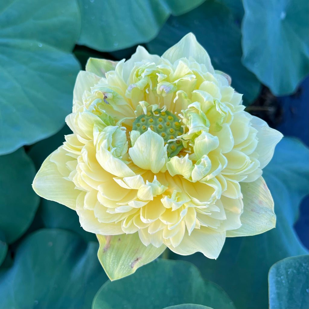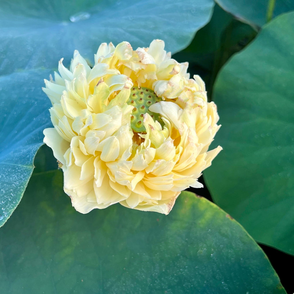 A lovely ethereal color makes this lotus desirable in any garden. It is difficult to describe the exact color of this flower. The extra light yellow has hints of smoky green. It has a full, frilly flower that is outstanding and long-lasting!