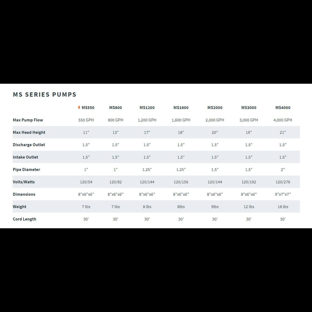 MS-0550 54 Watts 550gph 11' 1.5" 8" x 6" x 6" 7lb