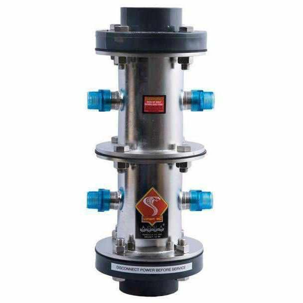 The Viper Series UVs are ideal for large commercial or residential ponds, aquariums, and water features. The specially designed 4-inch 400 Watt lamps disinfect faster and have greater cell penetration capability. The compact body design has a small footprint making it easy to handle, install and maintain. Vipers are engineered to accommodate extreme flow rates; minimum water flows must be maintained at 95 GPM. A flow switch, provided, shuts the unit off if flows fall below 95 GPM. Aqua Ultraviolet UVs will clear your water in 3 to 5 days sometimes overnight and keep it that way. Performance is guaranteed when sized, installed and operated according to our instructions.