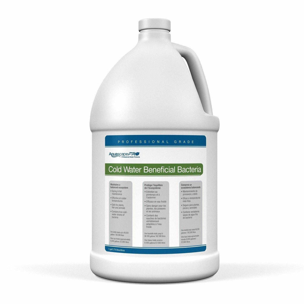 AquascapePRO Cold Water Beneficial Bacteria for Ponds helps to provide clean, clear, and healthy water conditions in water as cold as 35-degrees Fahrenheit, significantly reducing pond maintenance required. Each bottle of AquascapePRO Cold Water Bacteria is 25% more concentrated than the consumer equivalent and is packed full of eight pure strains of concentrated bacteria. Our Beneficial Bacteria will effectively reduce fish waste, ammonia, nitrite and organic debris in ponds. AquascapePRO bacteria contains a 4.5 billion CFU per ounce potency, ensuring consistently effective treatment and the included marigold and vitamin B helps to bring out the natural colors of your fish while maintaining proper fish health. The included measuring cup and dosage guide makes application simple and easy. Each bottle treats 96,000 gallons. AquascapePRO Cold Water Bacteria is completely safe for fish, plants, pets, and wildlife. Aquascape is passionate about the products we produce, providing unique products, designs, and features that stand above the competition.
