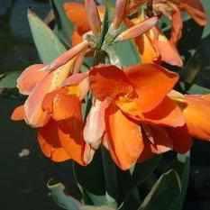 Canna 'Chiquita Punch' creates a unique statement with brilliant orange blooms that have yellow highlights, and emerald green foliage. Canna lilies are wonderful in the garden, and have huge iris-like flowers. They are wetland plants, so they prefer moist soils. This is a prolific bloomer during the summer months, so will keep your garden bright and full of color.