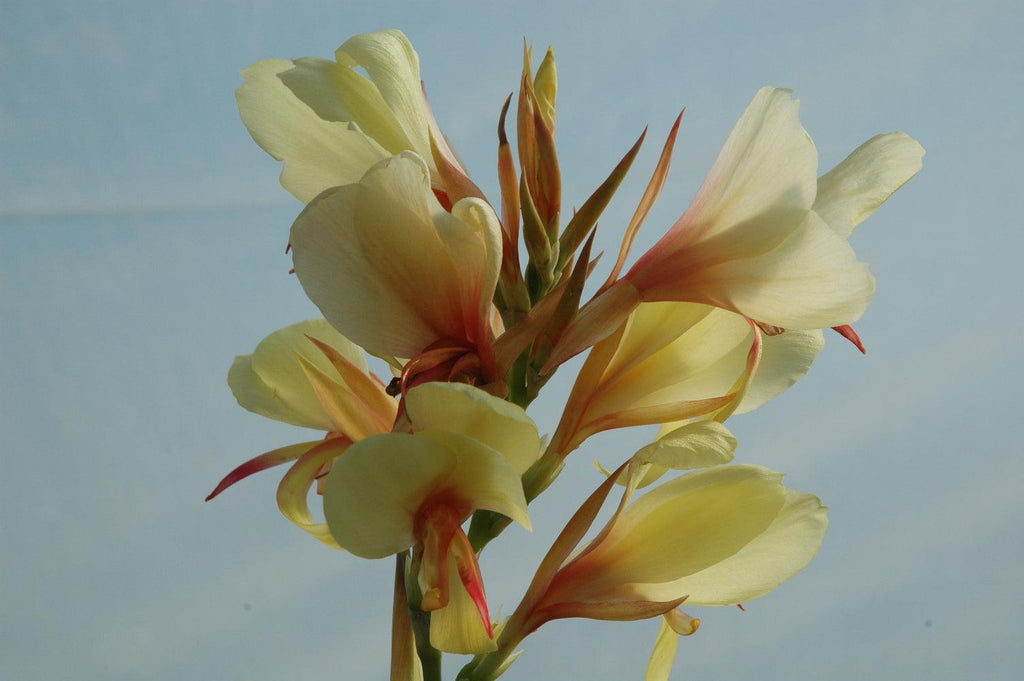 The blossoms are a pale-creamy yellow set off quite well with the contrasting grey-blue spear-like leaves this beauty has. Full sun to partial shade, Blooms summer to fall. up to 4'-5' (Mature) moist -boggy area but handles up to 6" water (Mature) Does not like windy areas.