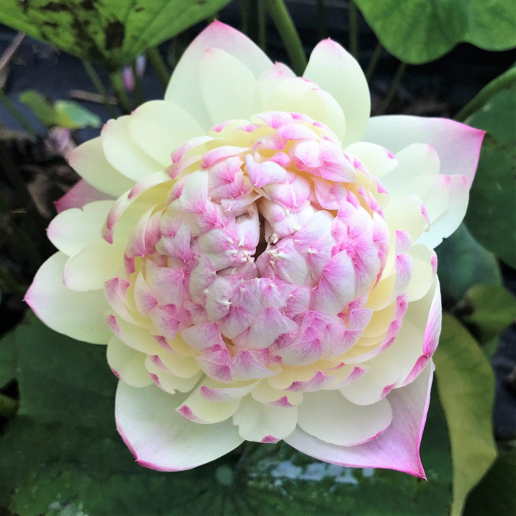 A most unusual bloom with elongated pink-tipped petals which form a tight ball and then unfurl slowly into a beautiful flower the color of heavy cream kissed with pink. This lotus will do especially well in areas with lower humidity and temperatures. Most of our customers report that this lotus blooms very often for them as it does here at our nursery.