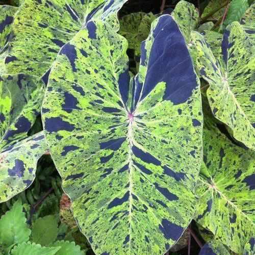 The 'Mojito' taro adds a wonderful tropical feel to your garden or waterscape, with its magnificent and showy heart-shaped olive green-colored leaves. Each uniquely decorated leaf is flecked with deep purple to black throughout, and grows to be be about 2 feet long, by 1 foot wide. These leaves droop toward the ground and are held on large, thick, succulent stems. The flowers, which are infrequent, or often hidden by the large leaves, are a yellowish-white and have a calla lily-like shape. This sun lover grows between 4 and 6 feet tall.