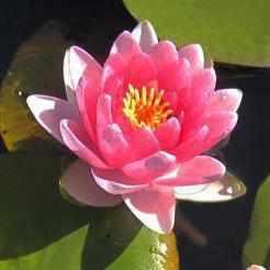 Very free flowering medium to large lily with large blooms; deep red inner petals with pink and white on outer petals. Watermelon-red on white. Goblet-shaped blooms of 6-8 inches. Grows to 6-8 feet wide in full sun in 6-48 inches of water. Good for medium-large ponds.