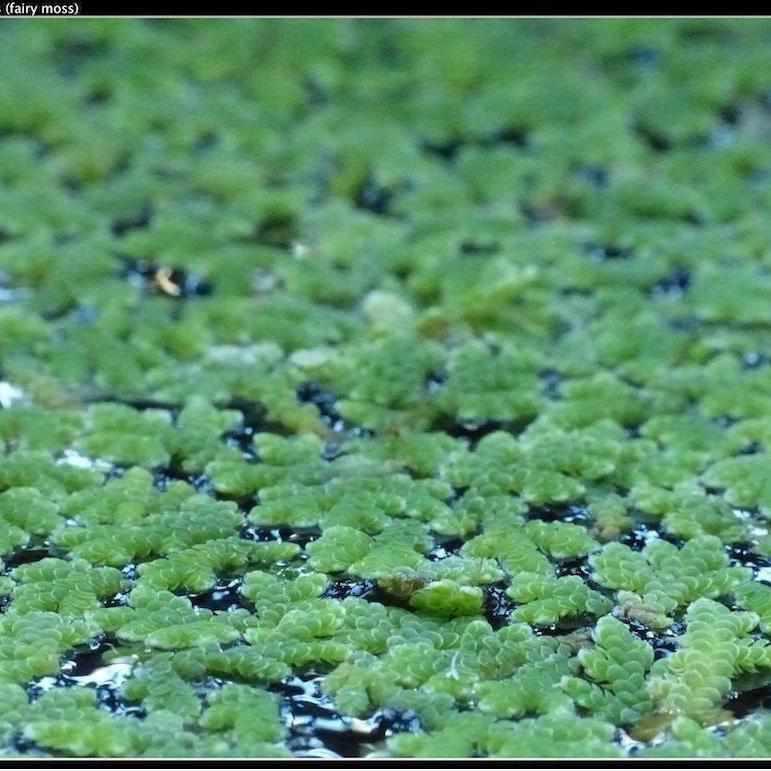 This is a member of a special group of ferns, the Salviniaceae, which includes one other genus, Salvinia. Azolla comprises 6 species, the most common two are A. caroliniana and A. filliculoides. We make no attempt to separate the two because the differences are nearly imperceptible. Azolla makes a great cover for water or mud.