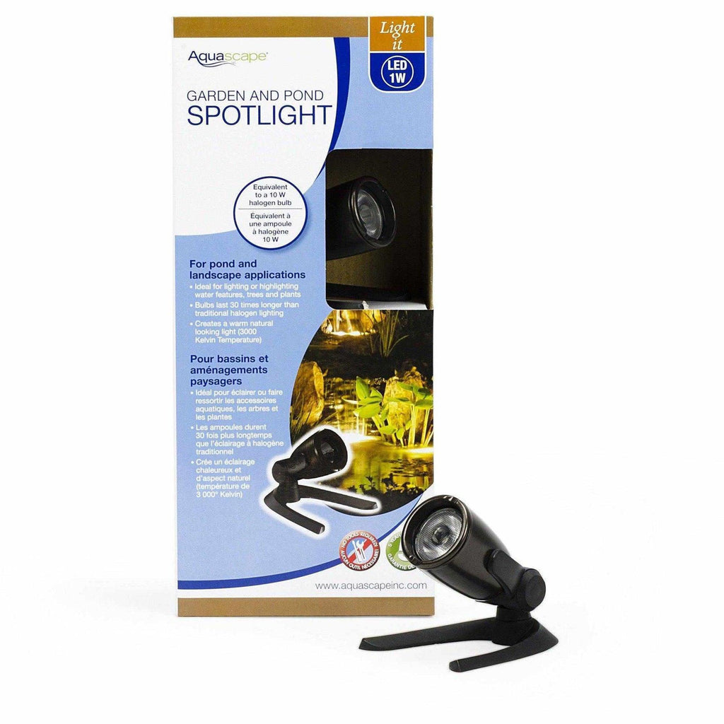 The Aquascape 1-Watt LED Garden and Pond Spotlight provides beautiful lighting options ideal for use in ponds, waterfalls, gardens or the up-lighting of plants. This energy-efficient, compact light can be placed anywhere a spotlight is needed, and it can be used either in or out of the water. The 3000 Kelvin temperature will provide natural-looking white light that will completely transform the way your water feature looks at night. Light output is equivalent to a 10-watt halogen light. The Aquascape 1-watt LED Spotlight is constructed of die-cast metal designed for years of use, and their quick connect fittings make for simple installation. Includes a removable mounting base can be wedged beneath large rocks or covered by gravel, ensuring the fixture maintains proper position beneath cascades. Aquascape LED Spotlights are completely sealed from water and come with a limited five-year full replacement warranty.