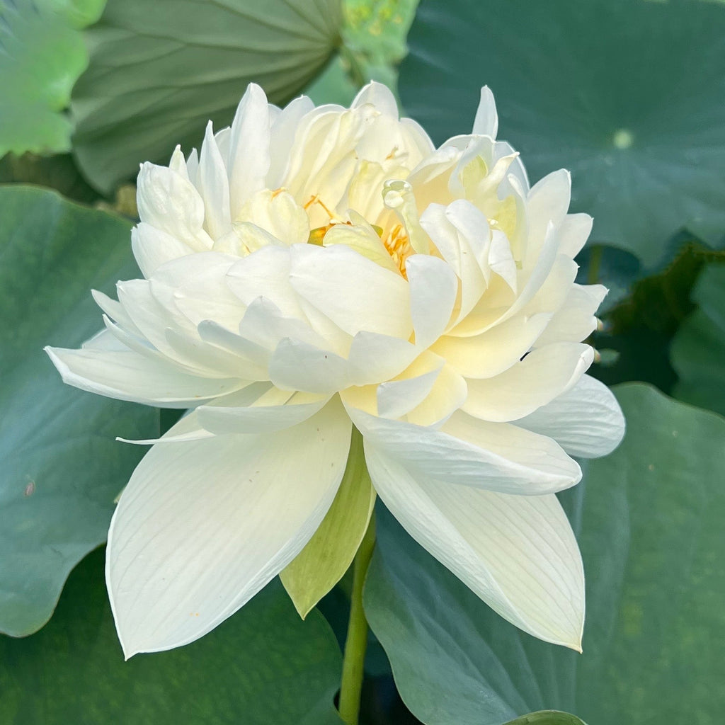 Our 'High Cotton' is named to honor all those hard working men and women who paved the way for us today. This lovely new lotus was grown from random seed that was a gift from Dr. Daike Tian. The outer petals are wide and make a perfect plate to hold the more narrow curled petals on the inside. Particularly bright gold stamen surround a lime green receptacle to make this new lotus even more unique.
