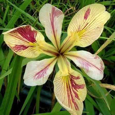 The 'Splitter Splatter' Louisiana Iris has showy cream white flowers with yellow and purple blotches and gold signals that bleed to purple. It likes full sun to partial shade, blooms in early to late Spring, and grows to 31 inches tall.