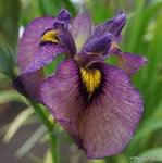 This interspecies iris has large, splendid flowers that are dusky purple with a large dark purple halo around yellow signals. Eye-catching and blooms mid-late season. 38" tall