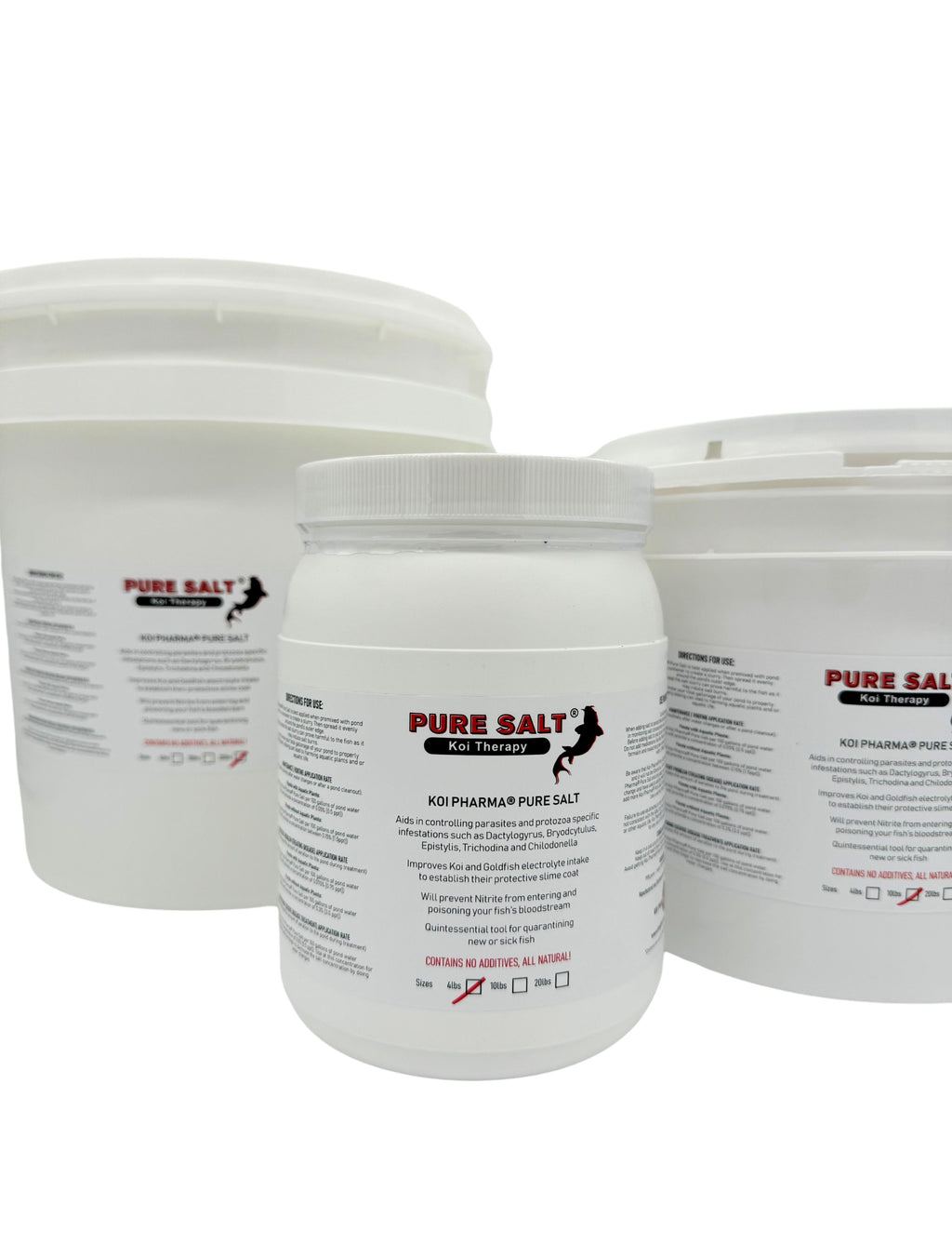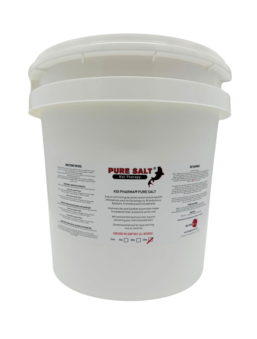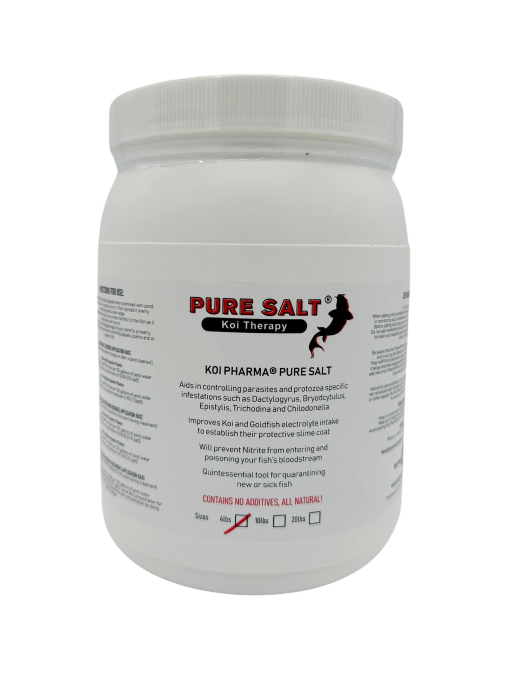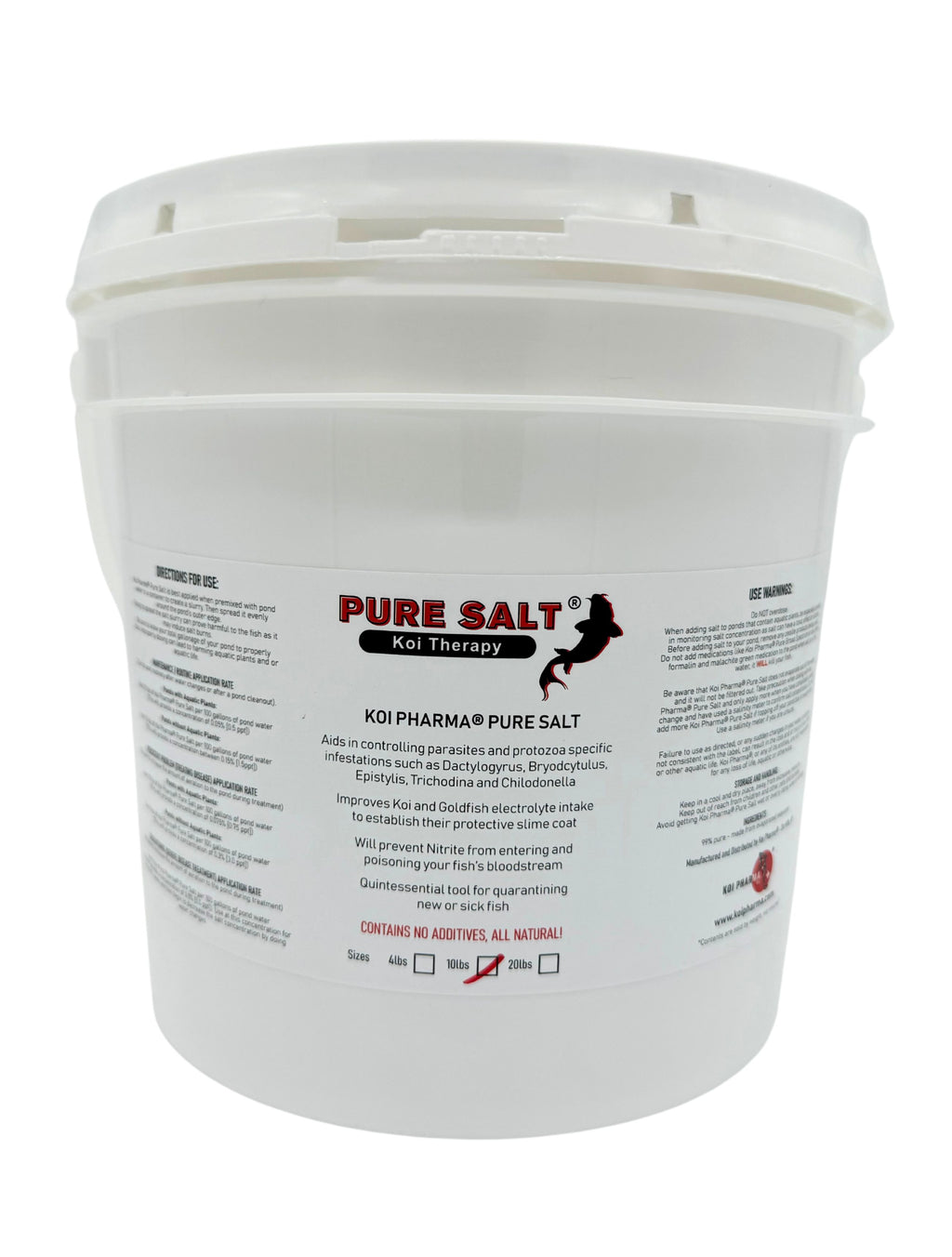 Koi Pharma® Pure Salt is a proven solution against nitrite toxicity, preventing Brown Blood Disease when used as directed. It effectively combats stubborn bacterial infections and protozoan parasites, including costia, trichodina, chilodonella, flukes, and other ectoparasites. Containing no iodine, chloride, or other harsh chemicals, it is safe for fish, birds, plants, and domestic animals that drink from the pond when dosed correctly. Available in 4-lb, 10-lb, or 20-lb bucket sizes, Koi Pharma® Pure Salt is a necessary product for your koi medicine cabinet and a go-to treatment when quarantining new or sick fish.