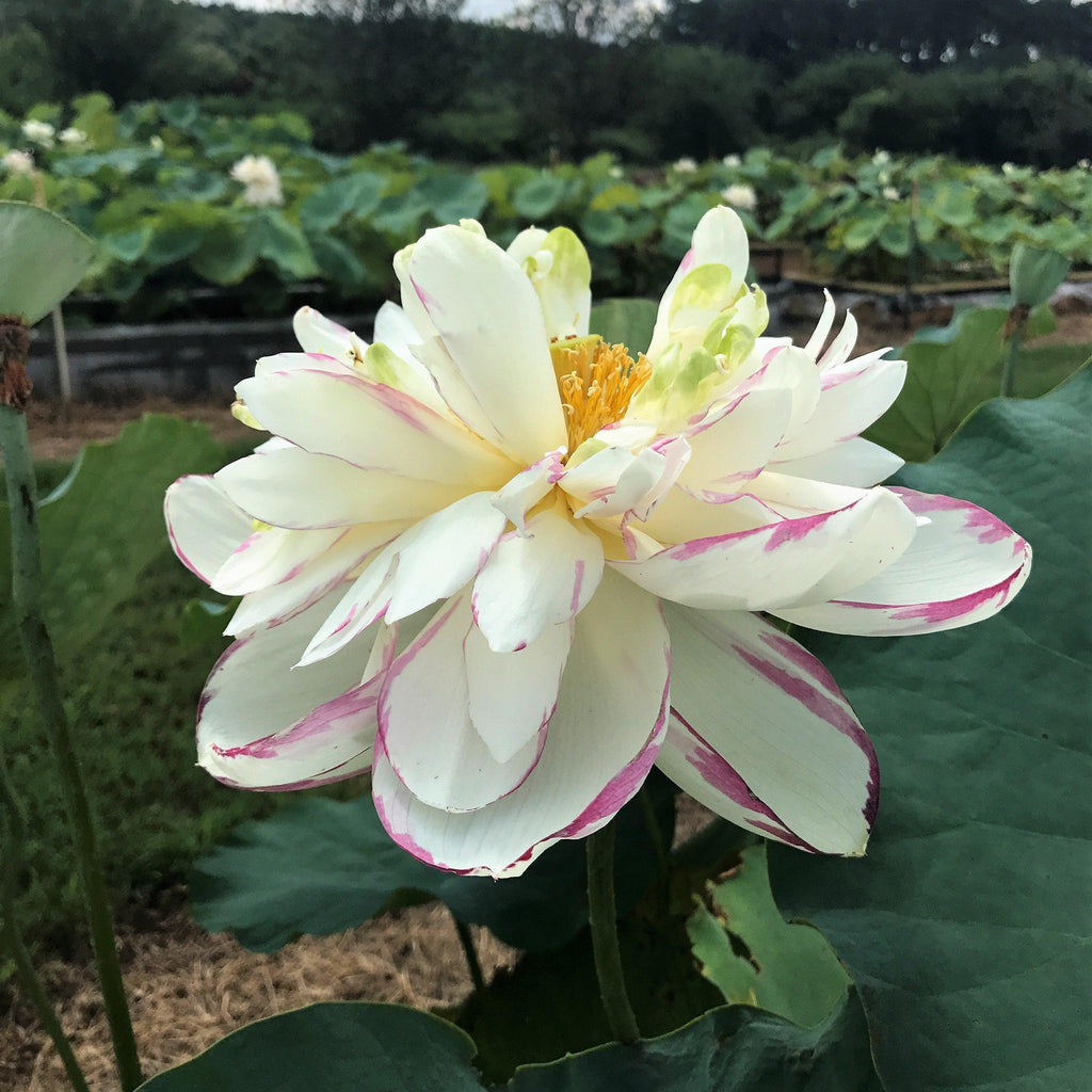 HUGE creamy white flowers (10"-14") with a jagged picotee of purple along the outer edge of the petals. The inner petals are tipped with green. Even the bud carries a splash of purple making this one of our favorite large lotus. If you are really lucky you might get one of these rare flowers with a giant purple stripe!