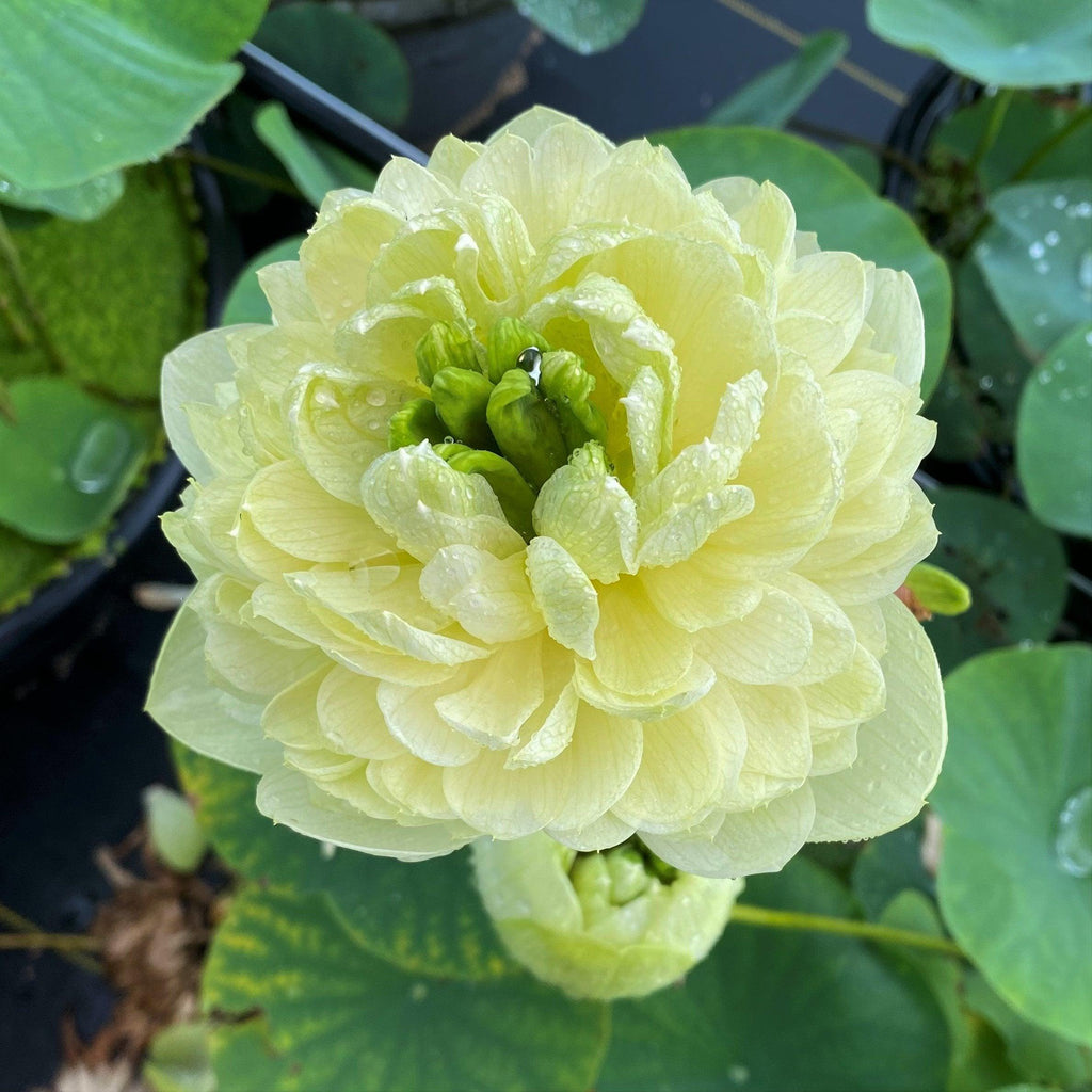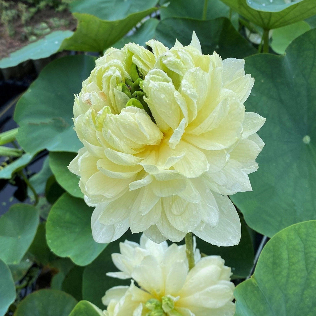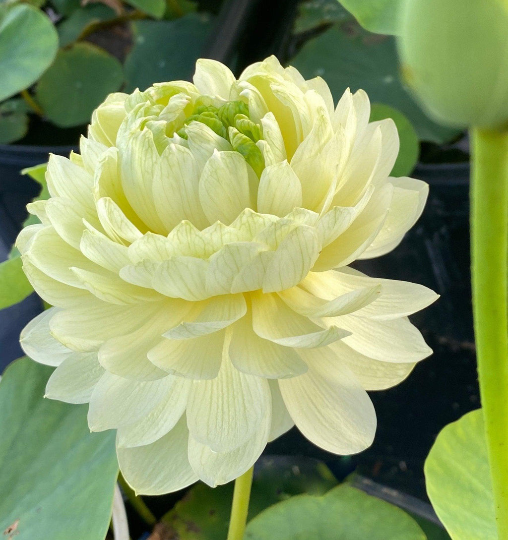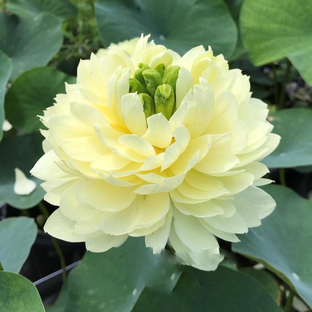 Is it yellow? Or is it green? This lovely lotus can be both! The green flowers are more evident early in the season when the weather is a bit cooler with the rich, butter yellow color becoming more common later in the summer. The flower of Lemon & Lime is very round, mounded and held higher than the leaves. It is almost always duplicate with showy dark green petaloids in the center. The flower is long-lasting and holds its color until the petals drop.