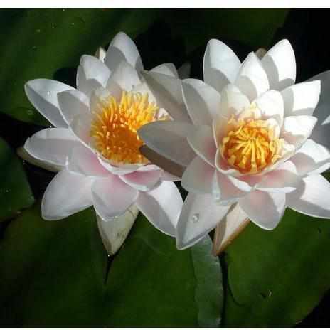 White with red flares. Cup-Shaped blooms of 4-6 inches. Has green leaves. Grows 6-8 feet wide in full sun to part shade in 6-48 inches of water. Good for medium-large ponds. Excellent bloomer, extremely vigorous.