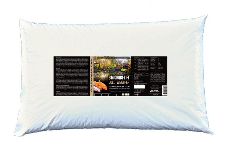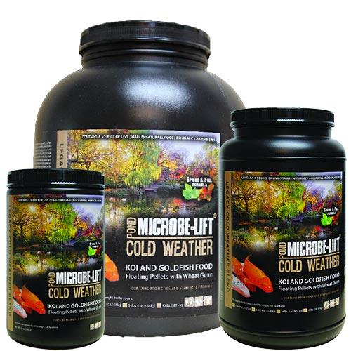 In the cold weather spring and fall when the night-time temperature goes below 55° F (13° C) feed the Cold Weather formula. When the pond water's temperature drops, the fish requires a highly digestible cool-water diet. The cold water diet is made with lesser amounts of protein but contains wheat germ which is easily digested and also contains a higher level of fats.