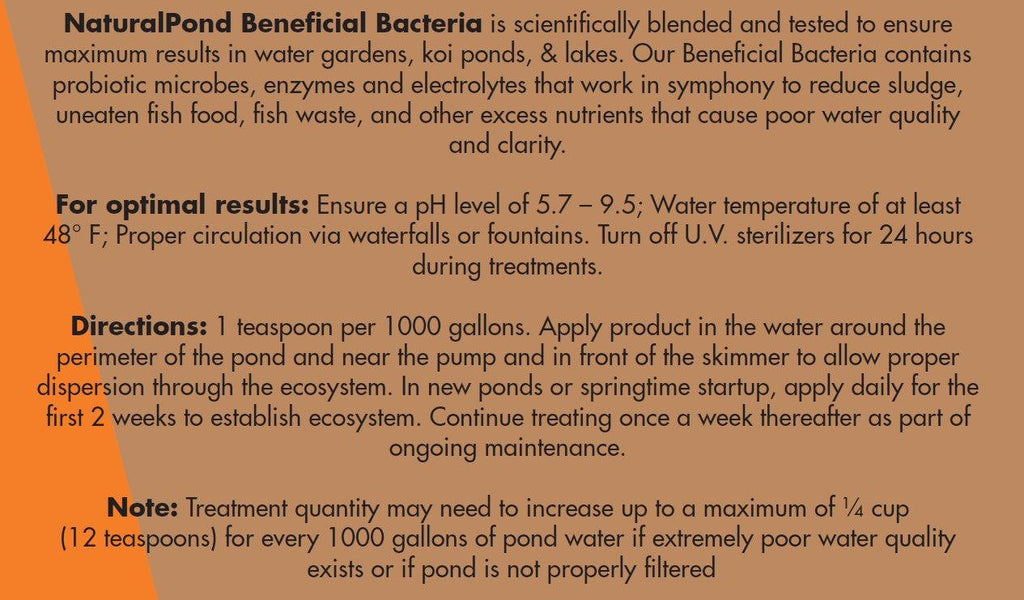 NaturalPond Beneficial Bacteria is scientifically blended and tested to ensure maximum results in water gardens, koi ponds, & lakes. This Beneficial Bacteria contains probiotic microbes, enzymes and electrolytes that work in symphony to reduce sludge, uneaten fish food, fish waste, and other excess nutrients that cause poor water quality and clarity.
