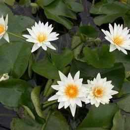 The 'Marian Strawn' water lily is a wondrous day-blooming tropical lily, with its large snow white stellate blooms, that have a slight gray tint, and are approximately 6 inches. The striking green leaves are streaked with purple. This lily has a spread of up to 6 feet, and is great for medium to large ponds.