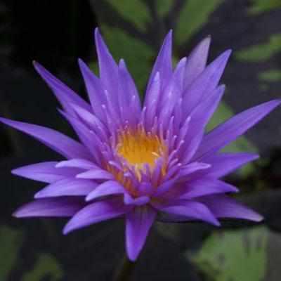 The 'Midnight Serenade' water lily is a glorious medium to large day-blooming tropical lily, with its double blooms in purplish-blue arranged above the green and dark red variegated lily pads.