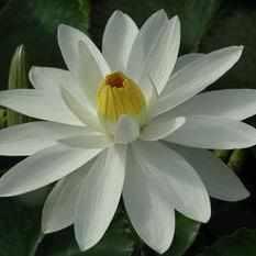 The 'Trudy Slocum' water lily is a heavy-flowering night-blooming tropical lily, that has classic, icy-white blooms, that are round or flat in shape, and approximately 4 to 8 inches in size. These flowers have yellow stamens, and are held above largely-scalloped, bright green lily pads. It has a strong fragrance. This lily opens before dusk, and closes in the late morning hours.