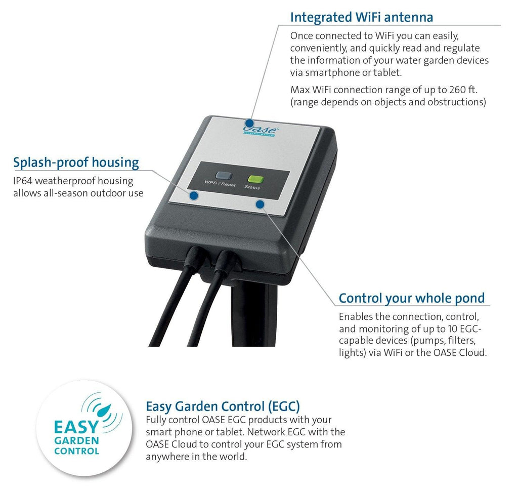 The EGC Controller is the heart of the Easy Garden Control system. Control up to 10 EGC Devices (Pumps, Filters, lights) via WIFI. The Oase Easy Garden Control system operates and monitors EGC devices, either locally or over the Internet. EGC-enabled filters, pumps and lights are directly linked to the EGC Cloud Controller with Connection Cables and controlled by the Oase Easy Control application.
