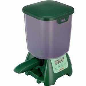 Designed for ponds, the Fish Mate P7000 Pond Fish Feeder is best used with pellet or stick food. Variable feed sizes are dispensed at times programmed by you -- or on-demand, at the touch of a button! Ideal for holiday feeding, the feeder's green color blends harmoniously into the garden environment.
