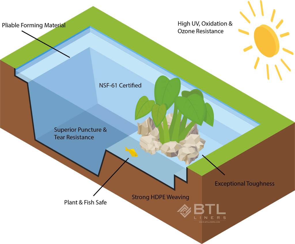 We also carry 20 Mil liner, 30 Mil Liner, 30 Mil Liner with extra UV protectant (our most popular), 40 Mil Liner, and 60 mil liner.