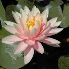 Grapefruit-pink. Flat, peony-shaped blooms of 6-8 inches. Green leaves with slightly variegated new growth. Good bloomer. Can grow 4-8 feet wide in full sun in 6-48 inches of water. Good for medium or large ponds.