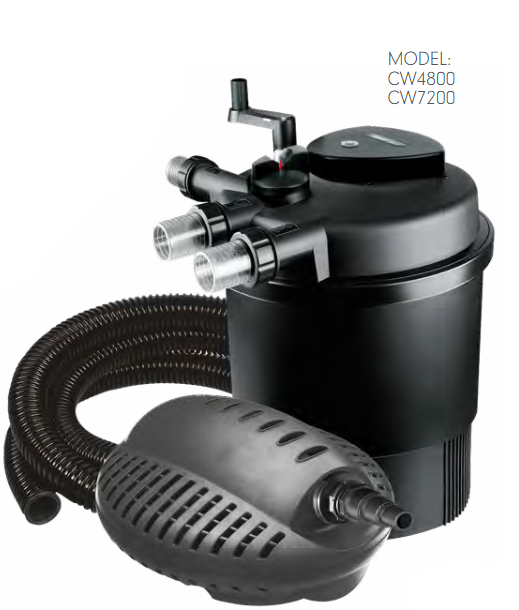 • Low maintenance backwash rinsing system - simply turn the switch to backwash mode and turn the handle to clean sponges.