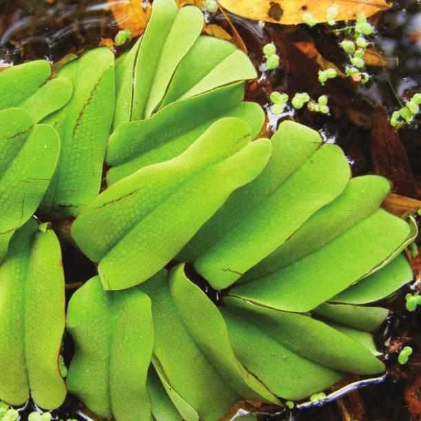 Tropical floating aquatic with larger, longer leaves than other water velvets. Salvinia oblongifolia is a small floating fern that grows in clusters at the edge of the pond like a floating carpet where frogs often sit.