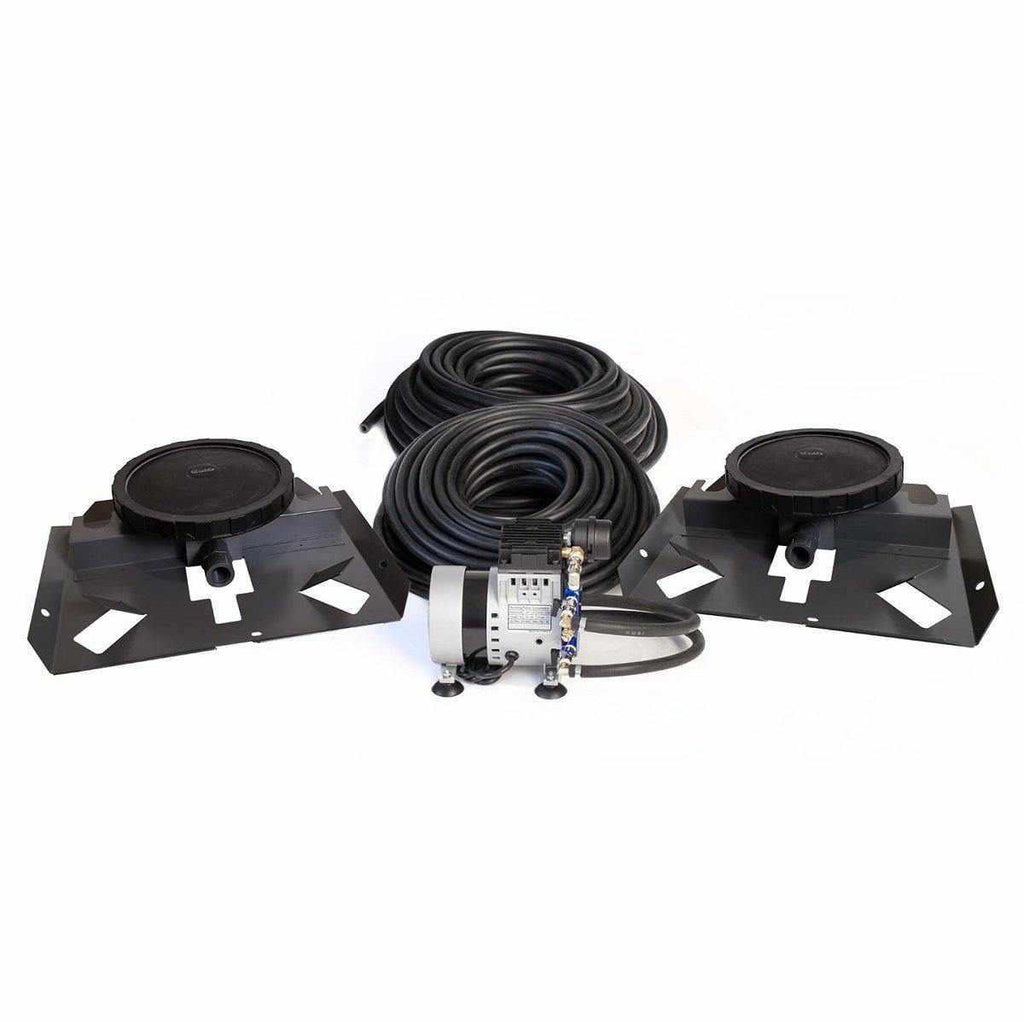 The Bubble Pro Sub-Surface Aerator consists of two diffuser modules, 200' of 3/8" QuickSink weighted tubing, and a 1/4hp rocking piston compressor, and an air output valve assembly with pressure relief valve. All necessary fittings and clamps are provided.