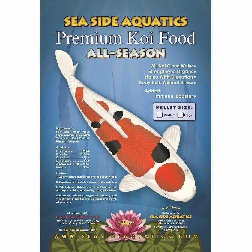 SeaSide Aquatics All Season is a premium Koi food without the premium price. Seaside Aquatics Hai Feng Premium All-Season Koi Fish Food helps to ensure exceptional health and color for ornamental Koi fish of all sizes.