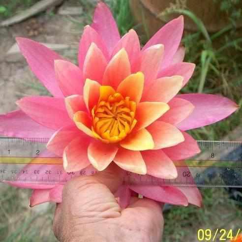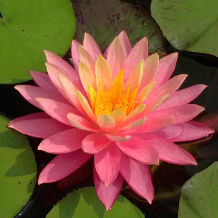 • Color: Green pads/Pink blooms with Yellow-orangy center