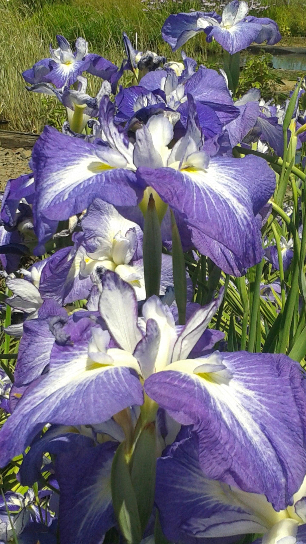 Plant Description Name: Iris Ensata "Violet" (Japanese Iris) ensata will produce bigger flowers than other iris, This Violet-deep purple flower with white veins is ideal for any pond, stream or bog. Blooms early summer-mid summer, up to 48" tall, Zone 5