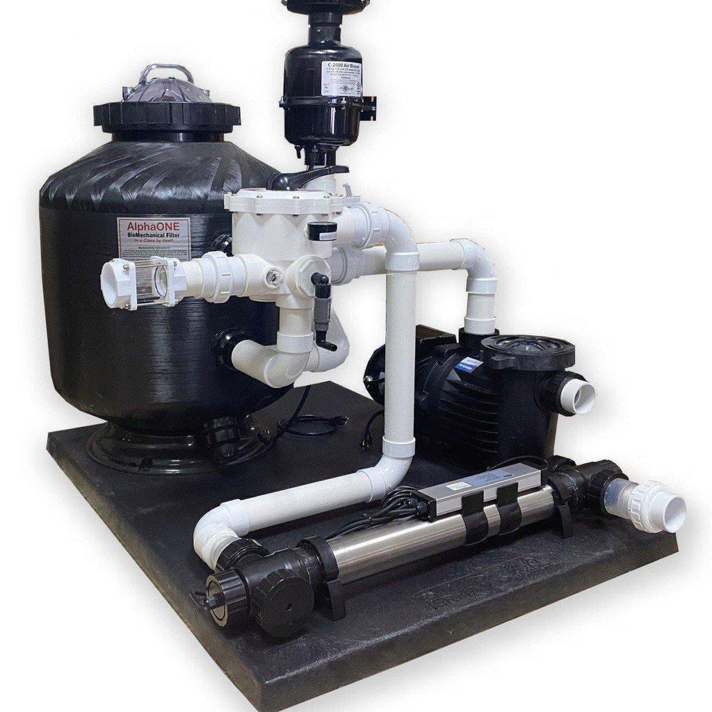 - Includes AlphaONE, AquaBead or AlphaNANO 1.75 Filter, 1/4 HP Artesian2 Low RPM pump-320 watts, and ZapTek2 40 watt UV, all pre-plumbed on a 36” W x 48” D pad.