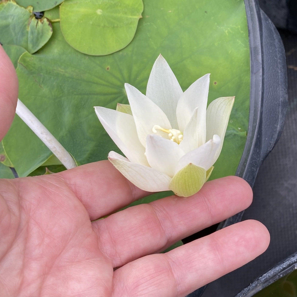 Peace and tranquility are a perfect description of 'White Buddha's Hand'. In response to many inquiries from our customers we searched until we found another pure white, single-petal lotus to add to our collection. This lotus can be grown in a very small bowl and proved to be a steady, dependable bloomer. We suggest using the pot-in-pot method when growing this lotus in a pot less than 8" wide - see below.